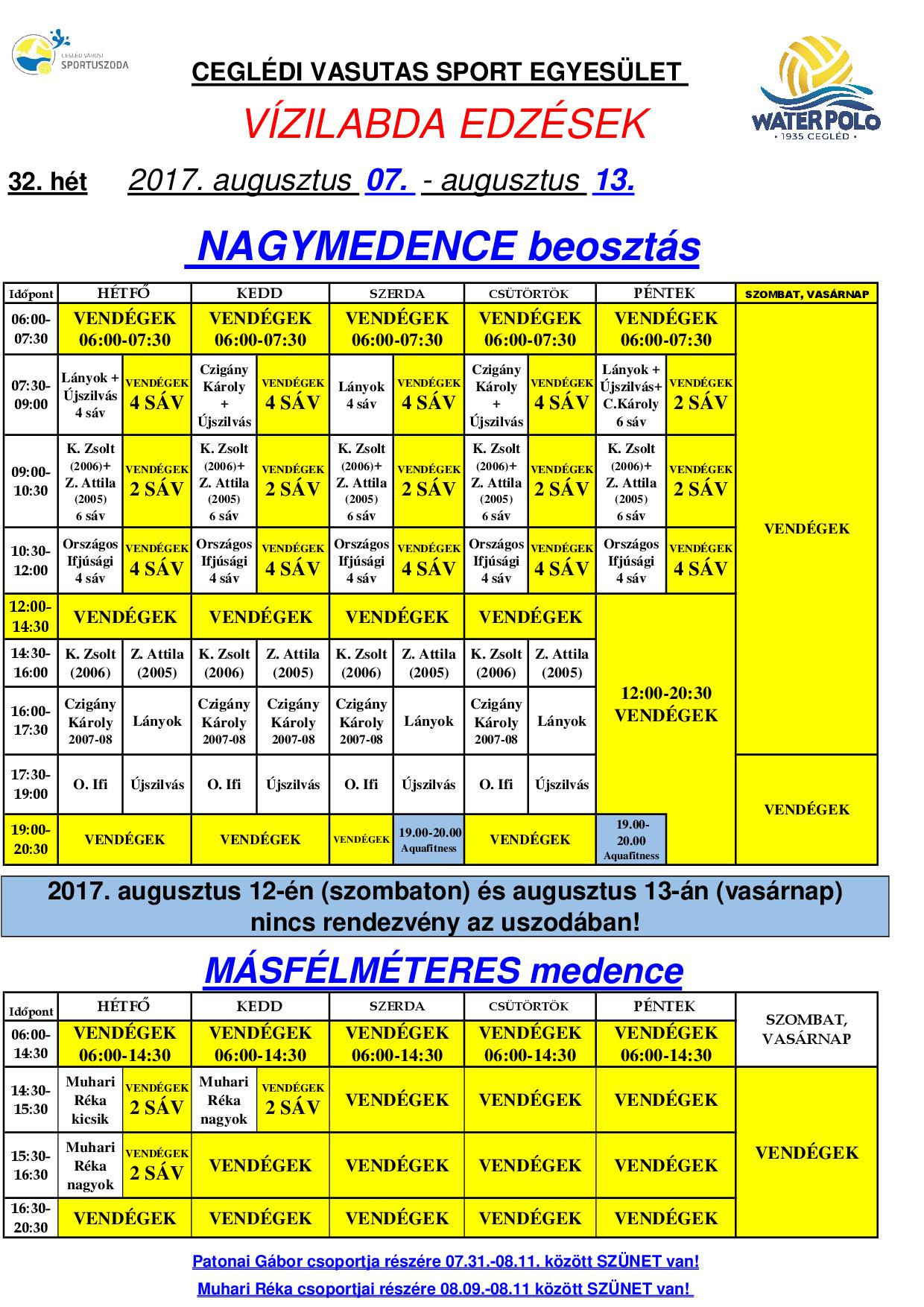 32. heti úszómedencék beosztása