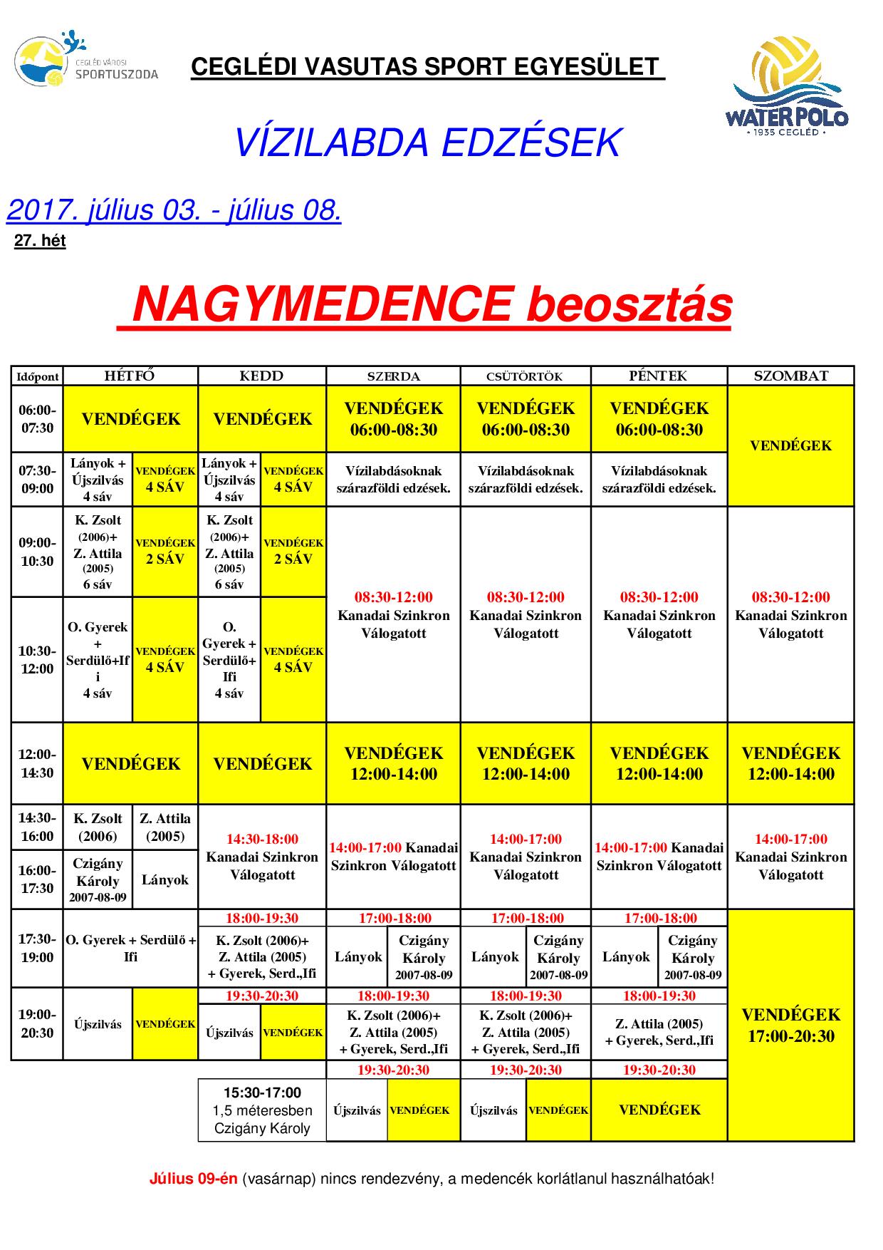 Július 03. - Július 09. közötti nagymedence beosztás