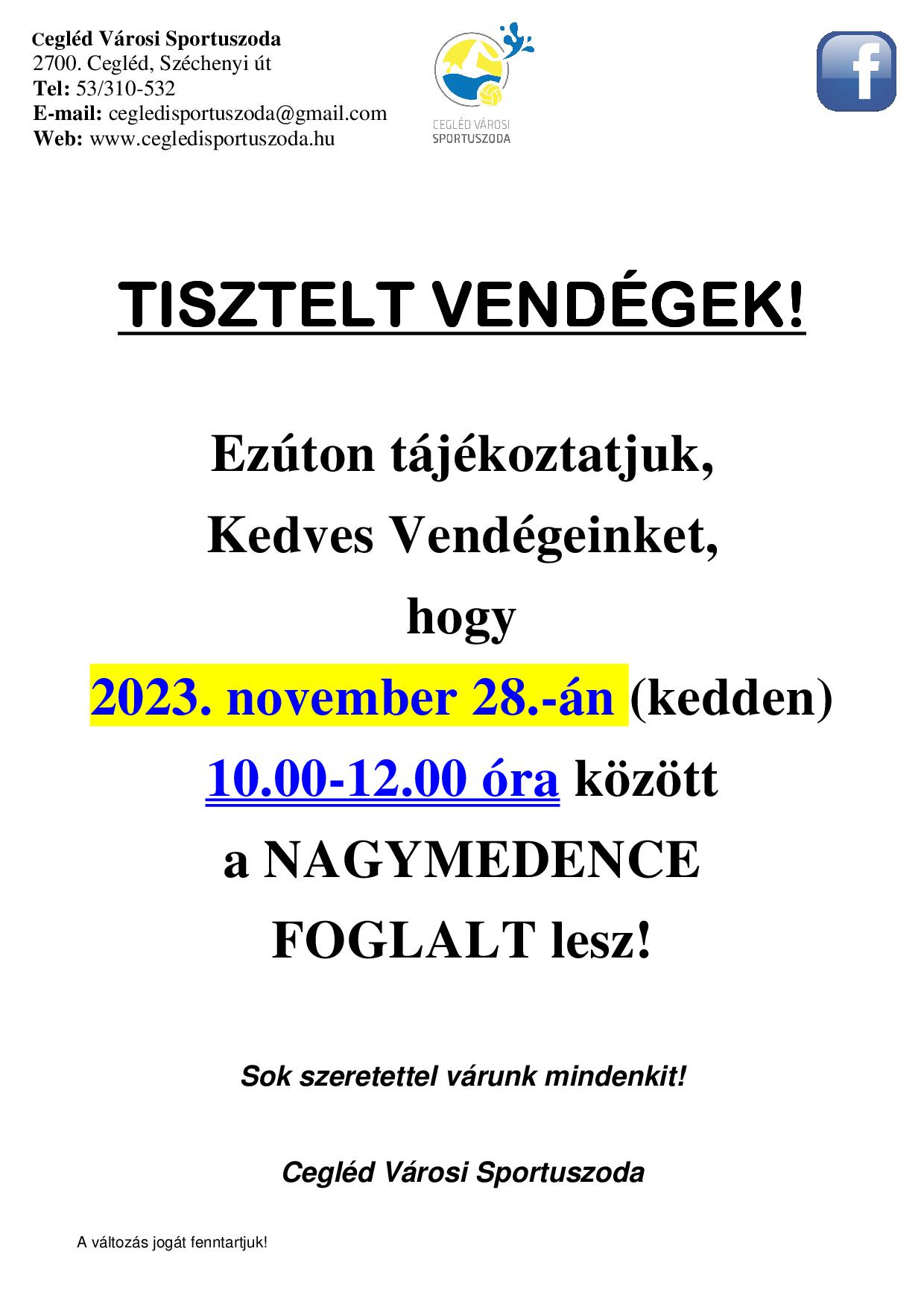 Kedden (nov.28.) délelőtt a nagymedence foglalt lesz!