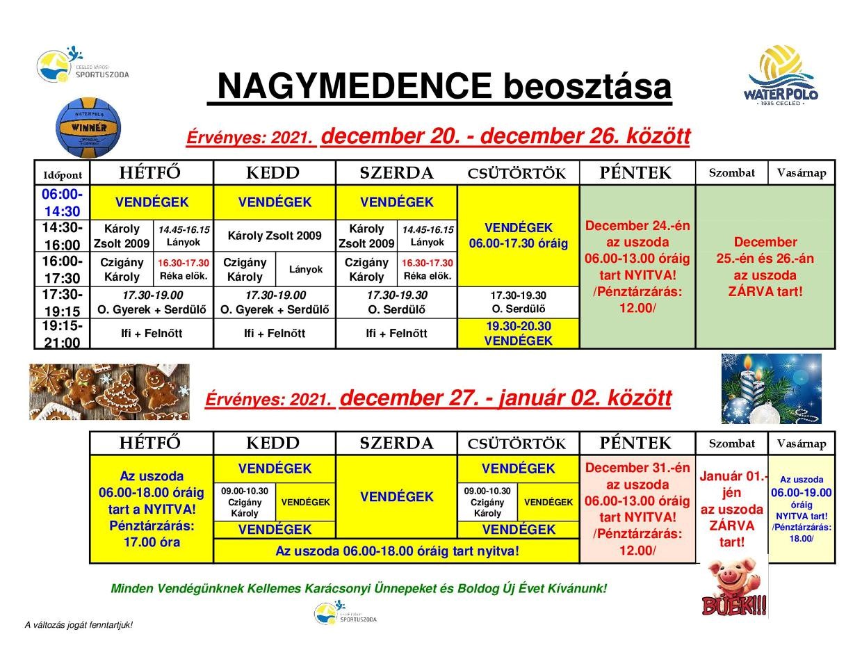 Nagymedence beosztásai az ünnepek előtt és az ünnepek között!