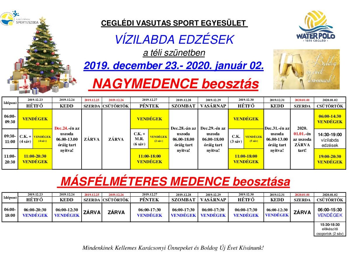 Úszómedencék beosztása a téli szünetben!