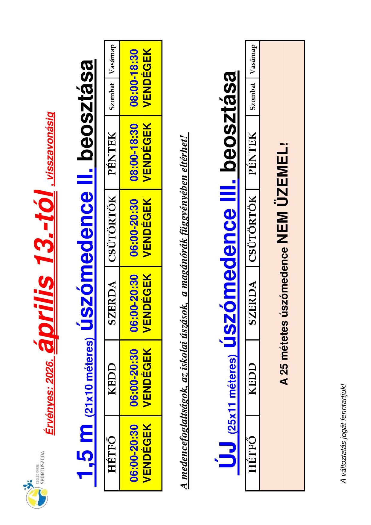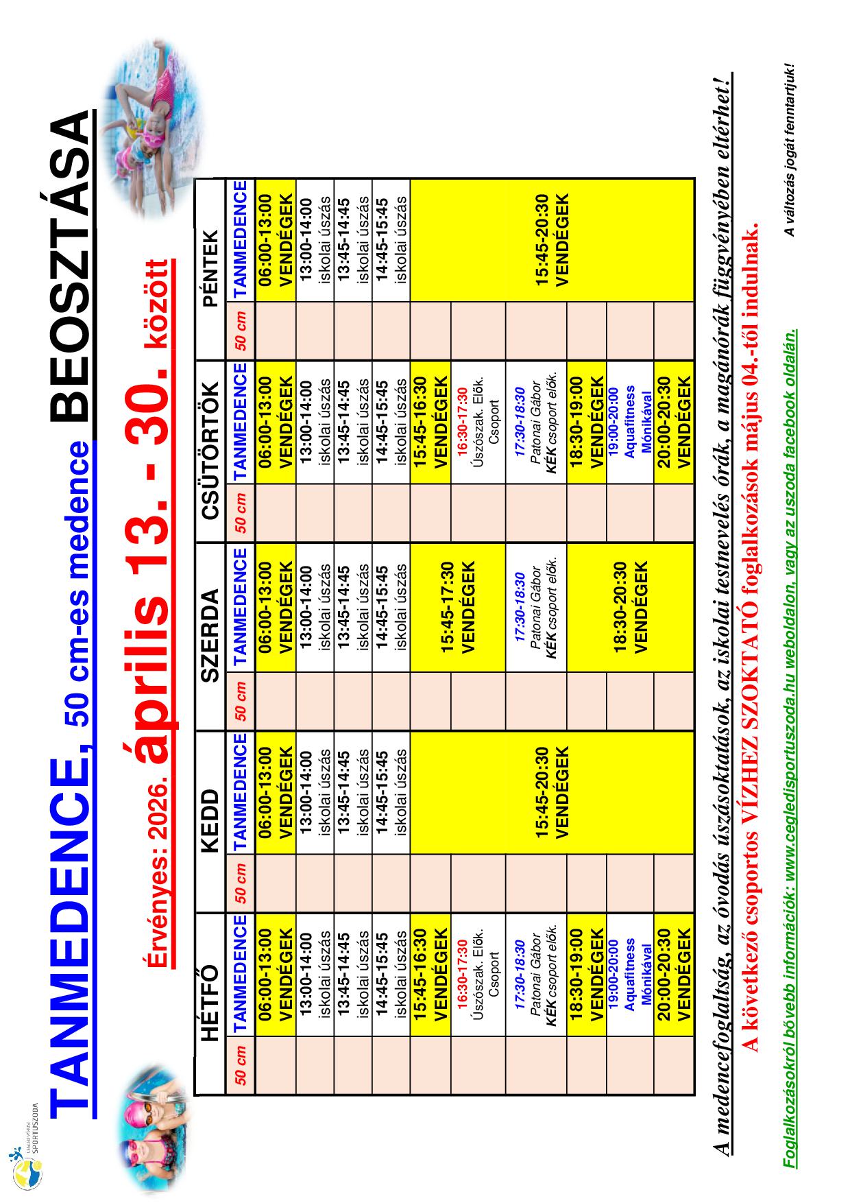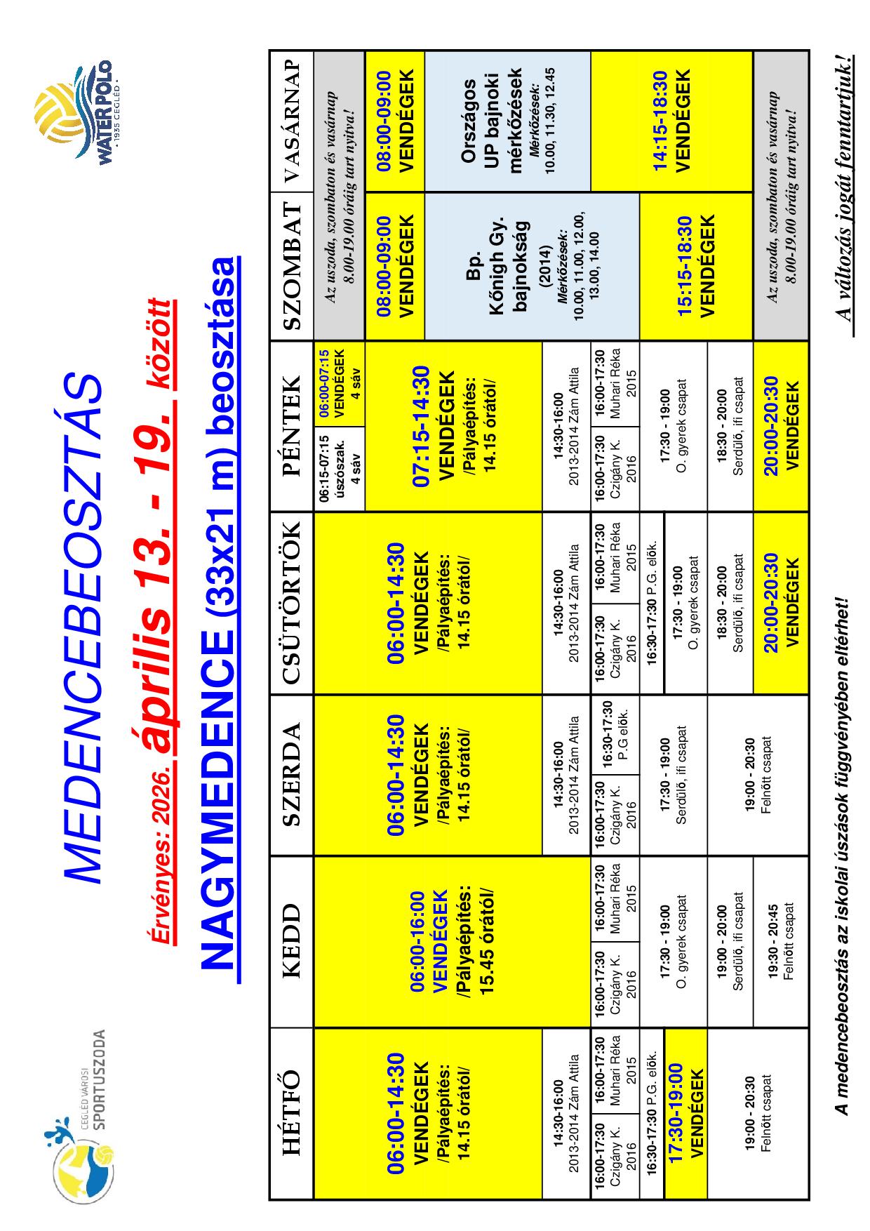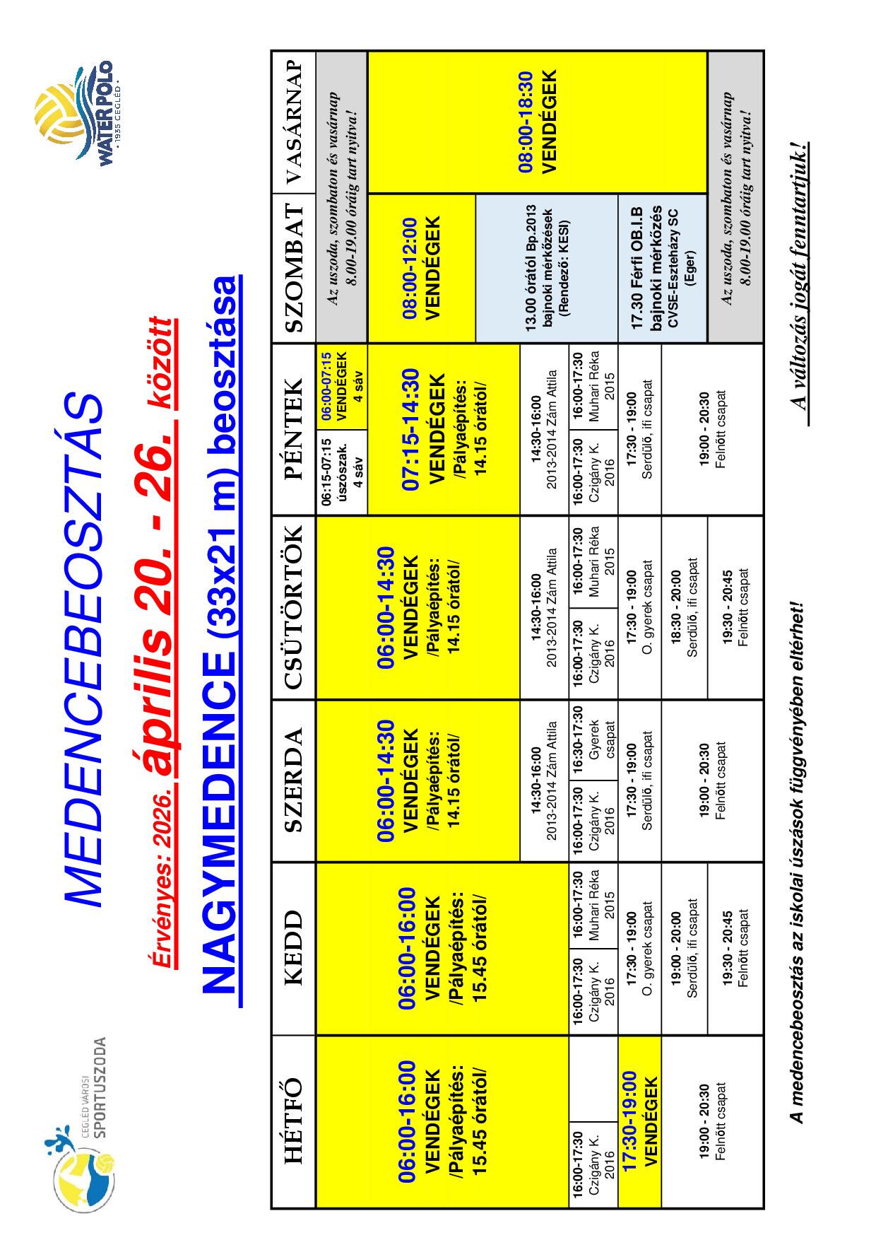 16. héten érvényes medencebeosztások